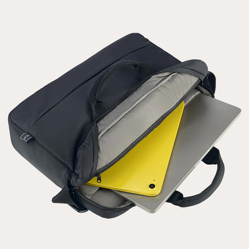 Borsa leggera e sostenibile in tessuto da plastica riciclata, dal design compatto e moderno per laptop e MacBook. Perfetta per lavoro e viaggio grazie a tracolla e fascia trolley.